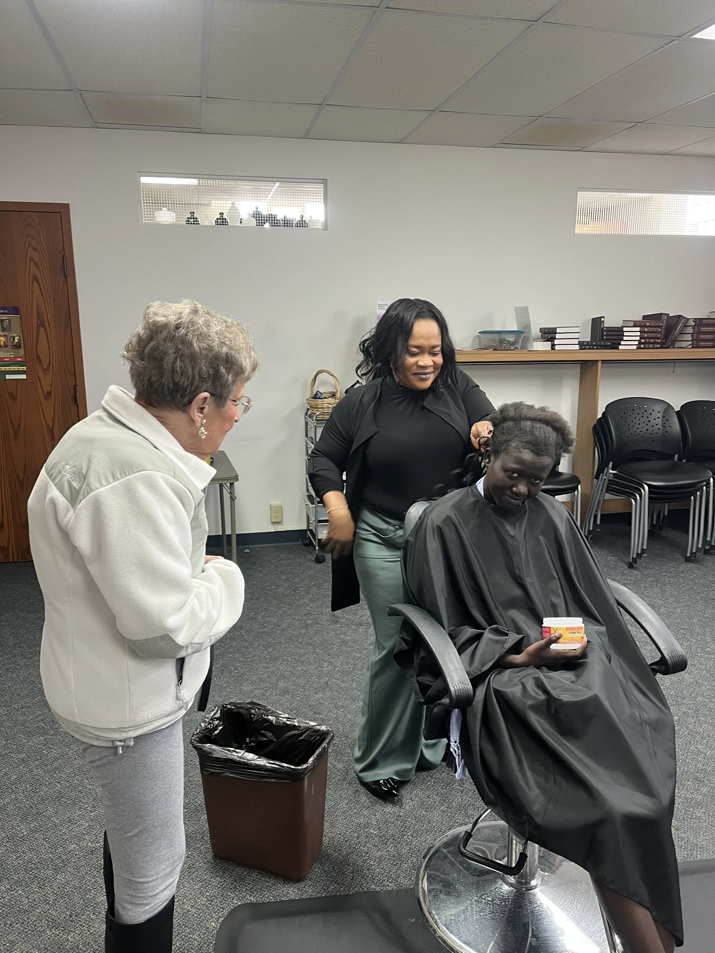 Two skilled braiders from Genesis African Braiding spent the day at Epiphany working carefully and attentively. By the end of the event, five braids had been completed. Anyone familiar with braiding knows that the process takes time. Five braids may not sound like a large number, but anyone who understands the work knows that it represents an entire day of service, attention, and relationship-building. Debra from Sudan, who was resettled in St. Louis in 2025, expressed her gratitude for the hair-braiding: “I have to work night shift and am always tired after I come home…so I don’t get much time to braid my hair. This is so nice that the church can do this for me for free. This is so helpful to me.”