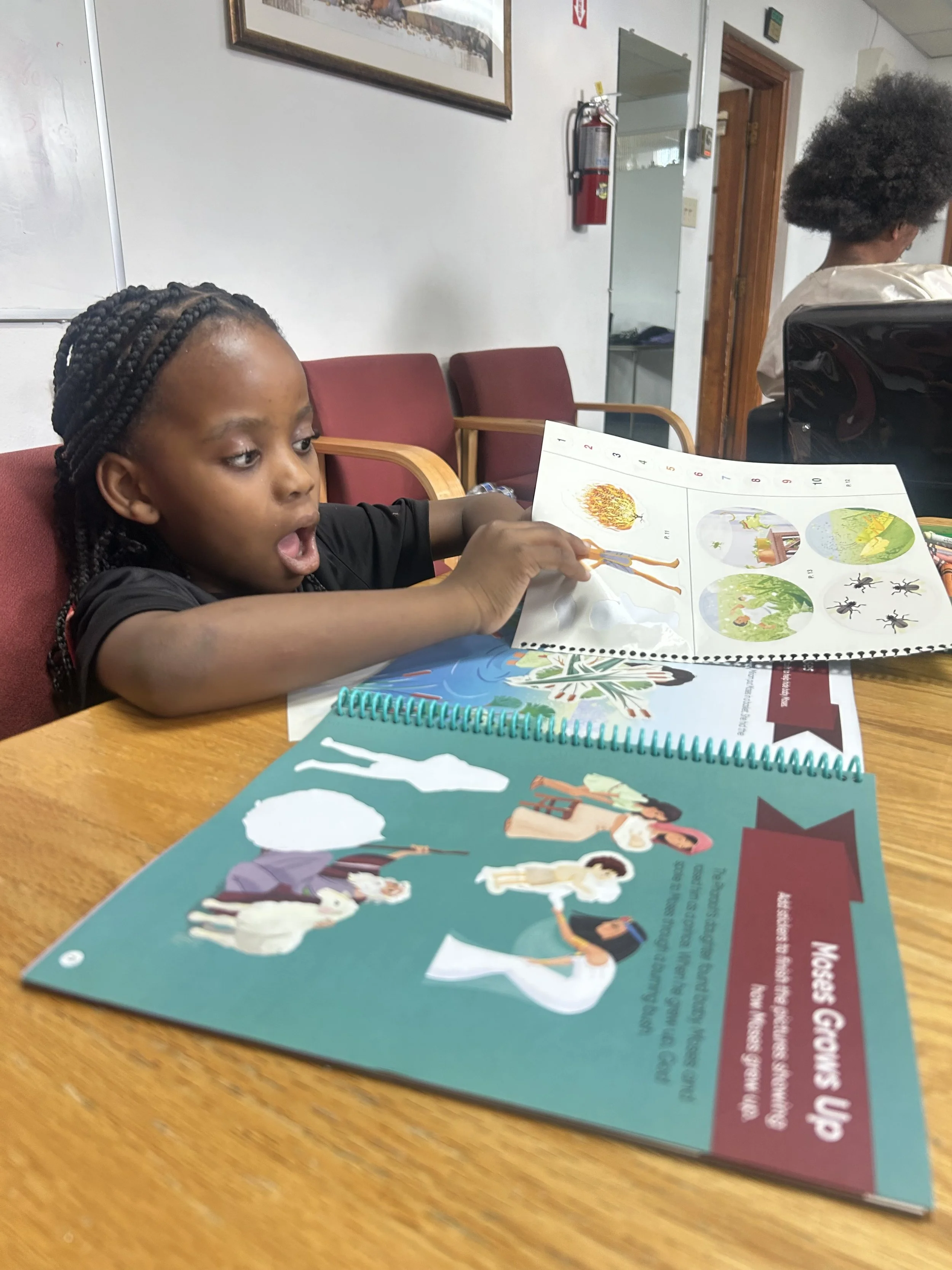 This event has now been hosted three times at Epiphany for New Americans connected with CFNA over the past several years. With each gathering, relationships continue to grow, and the ministry becomes more familiar to others in the community. What may seem like a small event represents many hours of service, conversation, and connection within the church community. During the event, the youth who had their hair braided also worked on Bible Activity Sticker Books, learning the entire story of Scripture!