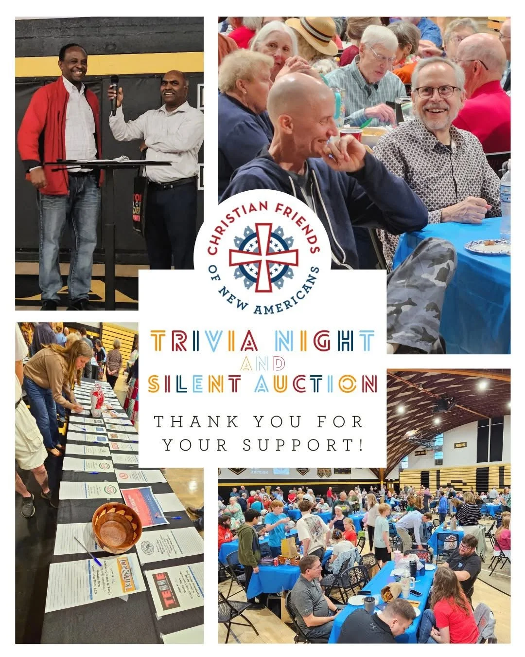 Christian Friends of New Americans welcomed a record number of trivia players (around 270 participants) to Lutheran High School South on Saturday, April 11th for the 19th annual Trivia Night and Silent Auction. Thirty-Five teams competed while fellowshipping and raising funds for the important ministry of CFNA.